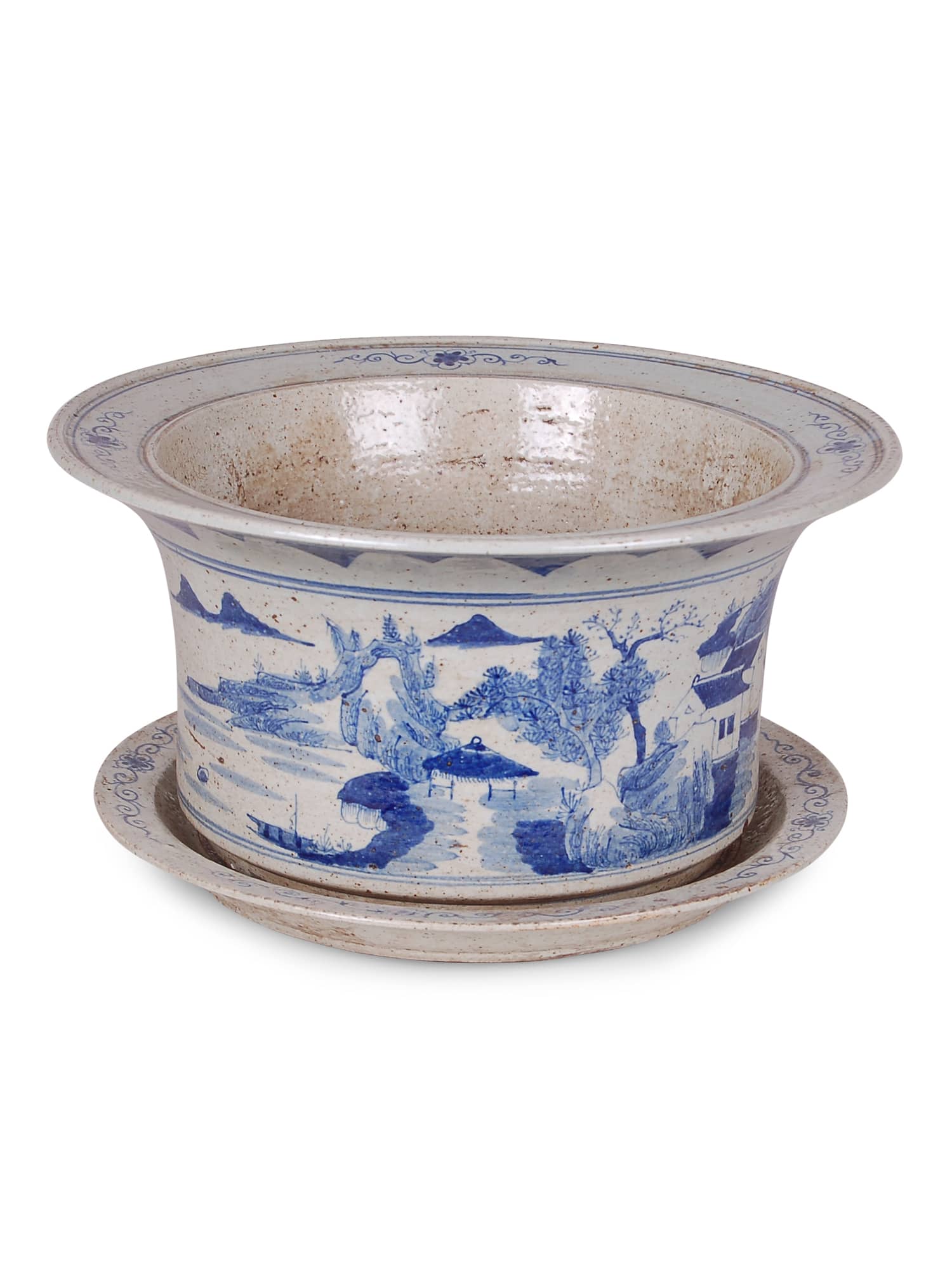 Reproduction porcelain planter with blue and white Canton design. Includes saucer. Made with foot-stomped clay.