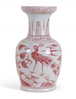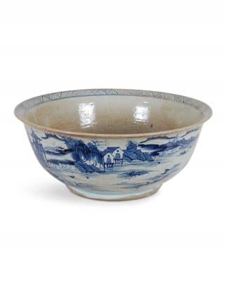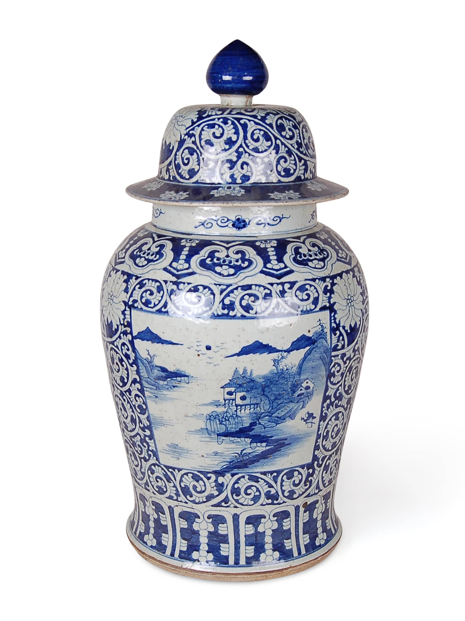 Reporoduction porcelain jar with lid in blue and white Canton design.