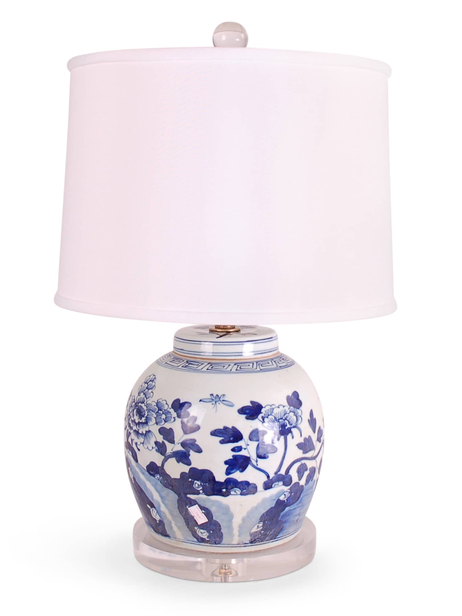 Reproduction porcelain jar lamp with blue and white design on acrylic base with drum shade.