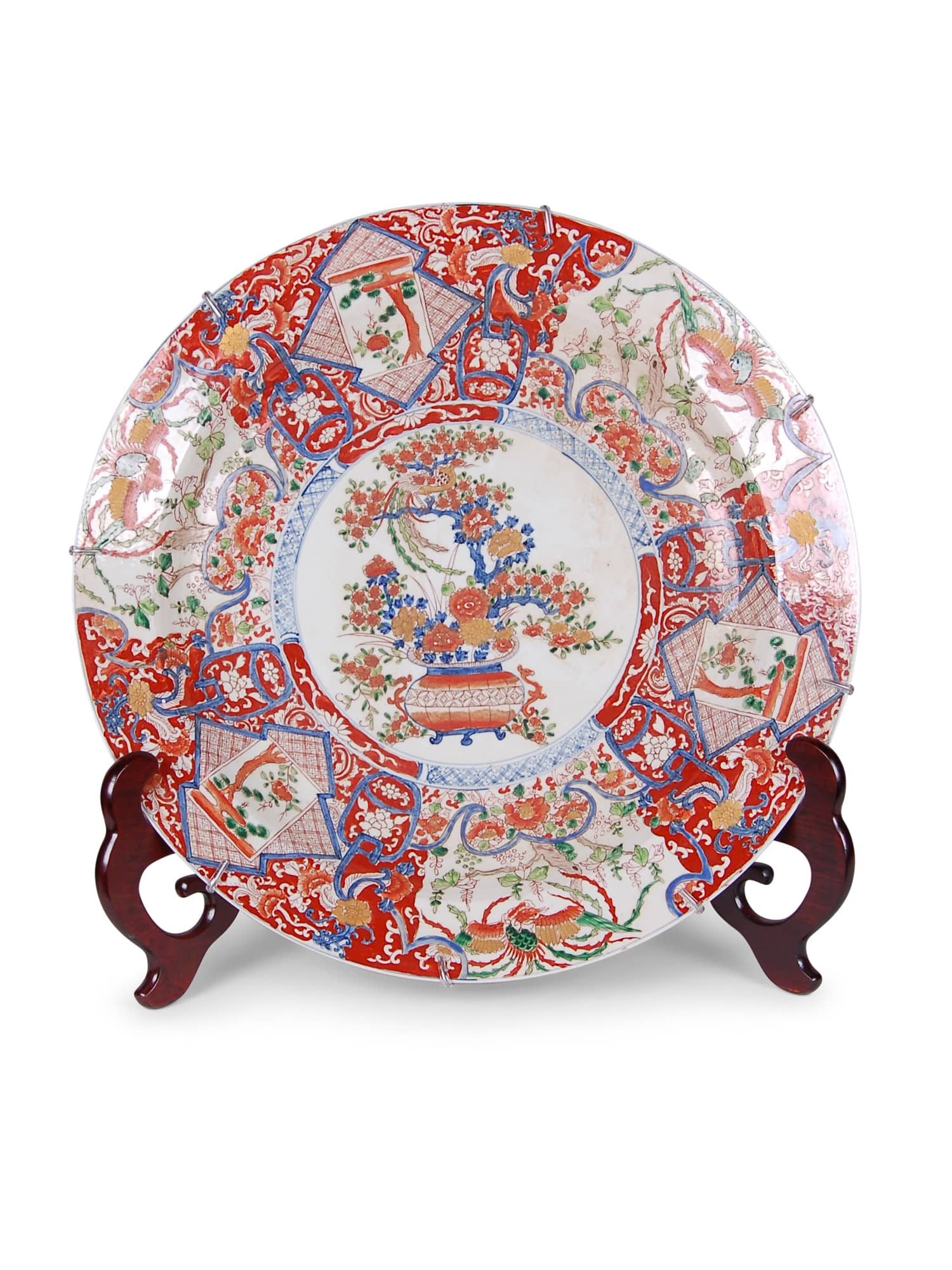 Reproduction porcelain charger with imari bird and flower design. Plate stands available.