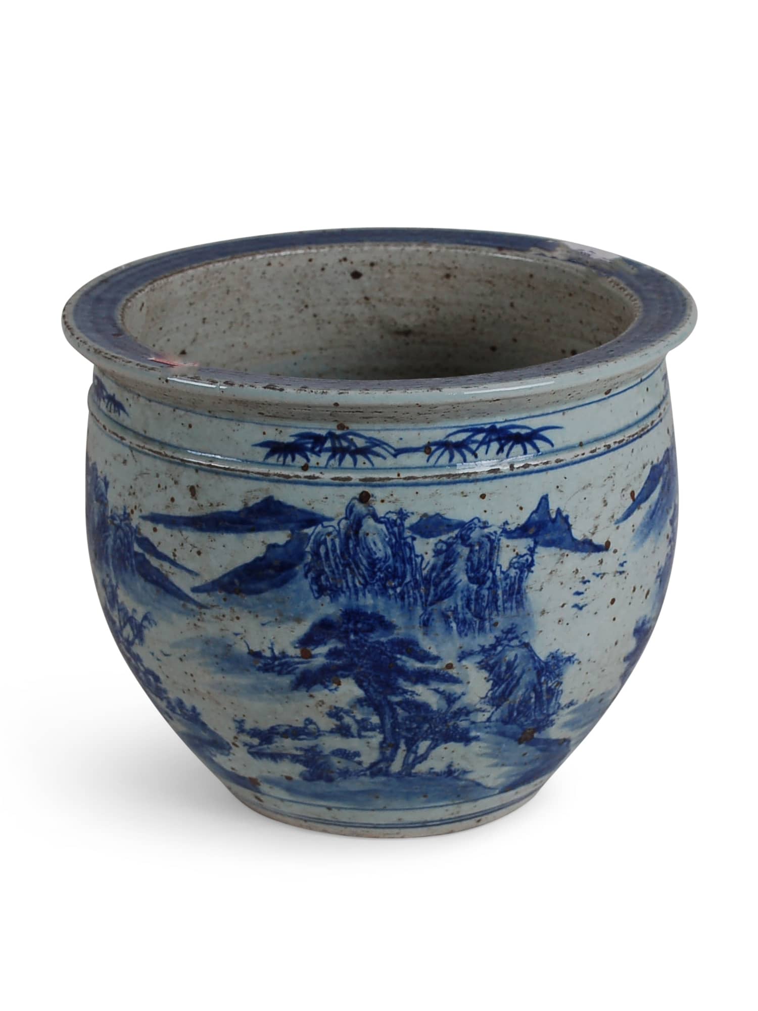 Reproduction porcelain flower pot with blue and white Canton design. Made with foot-stomped clay.