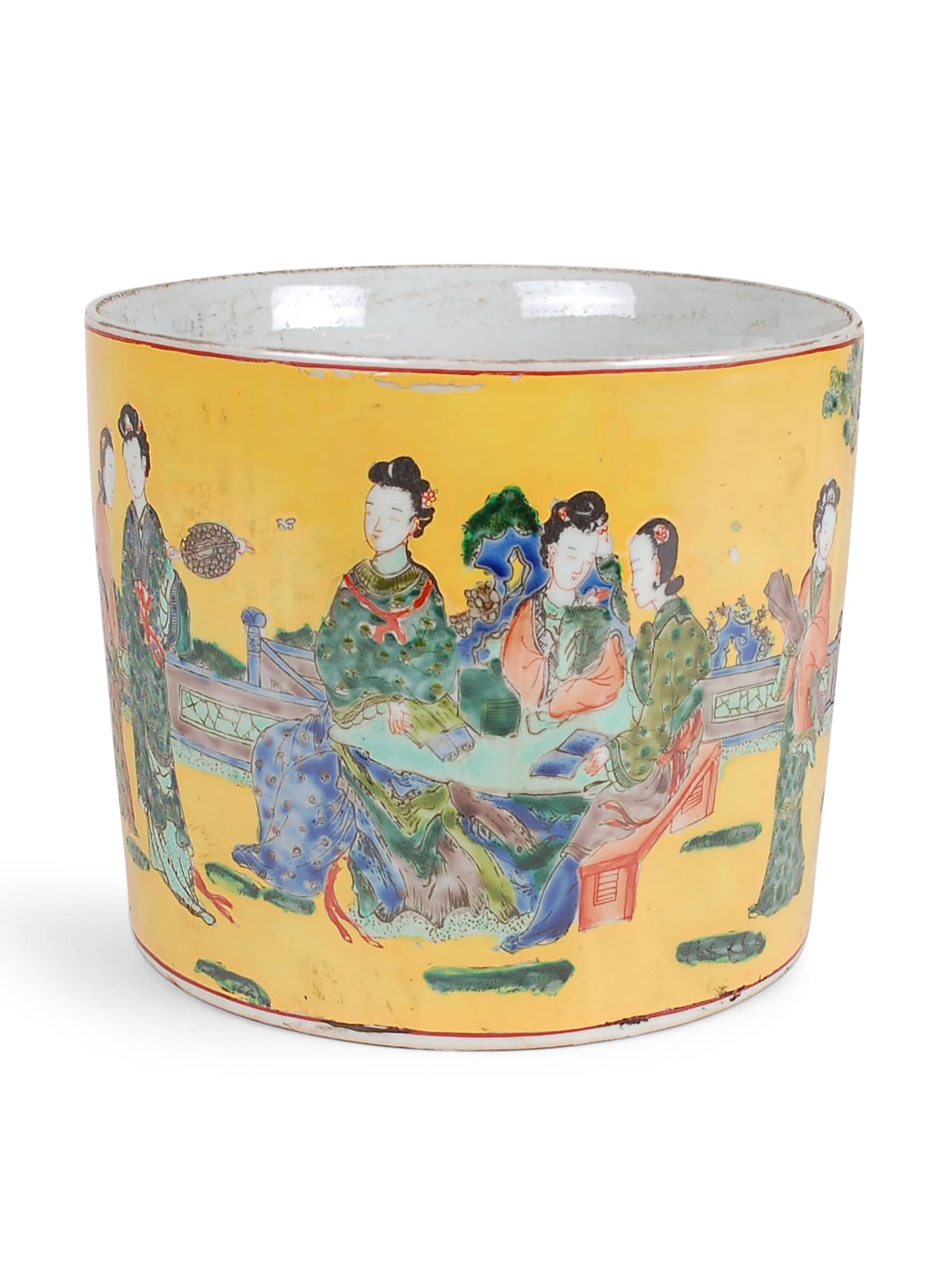 Reproduction porcelain beaker pot with multicolored figures design on yellow background.