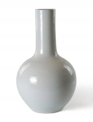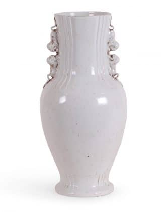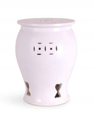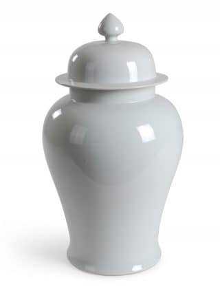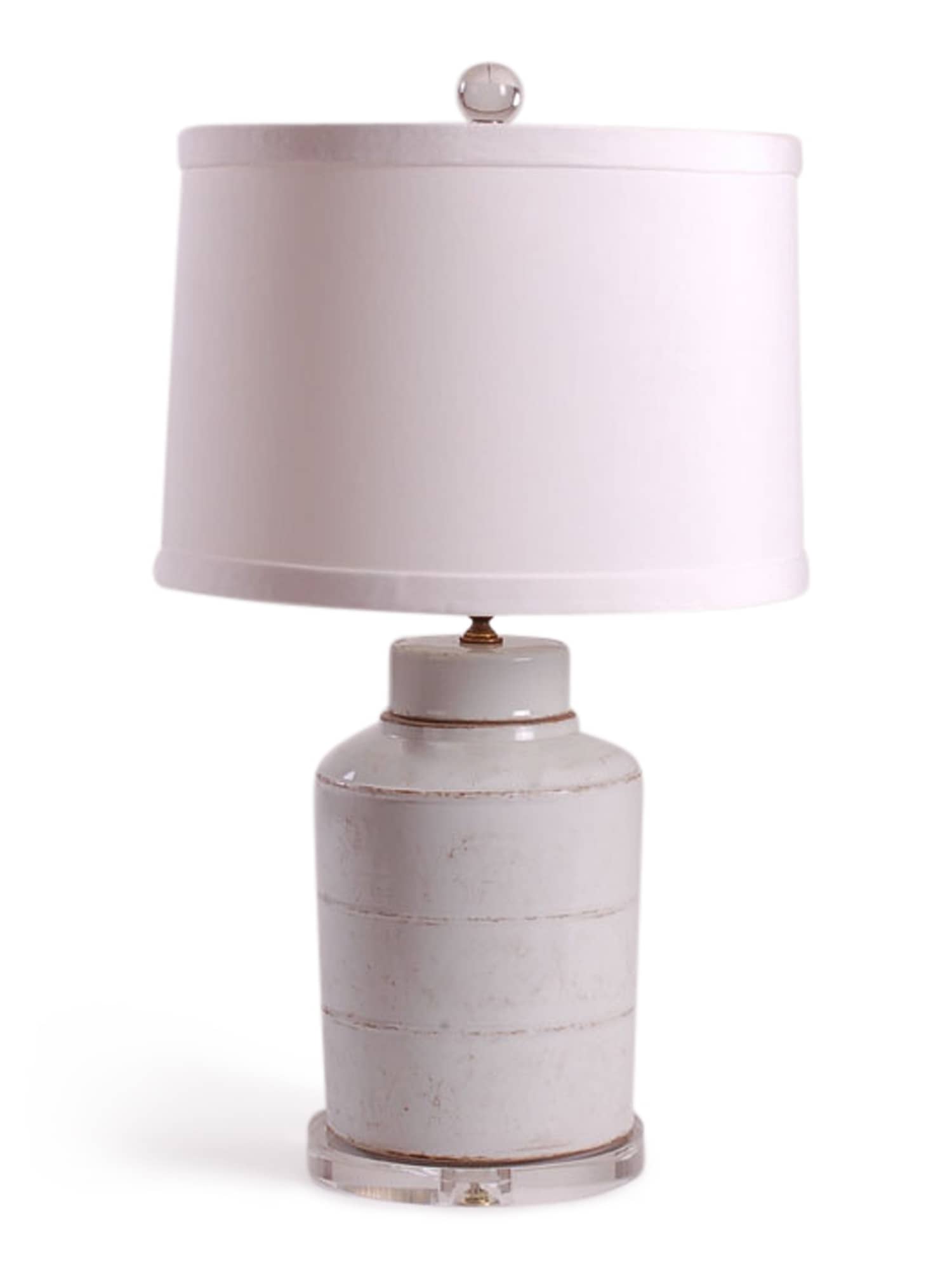 Reproduction porcelain tea caddie lamp in antique white with 3-banded design. Comes on an acrylic base with 0.5″ trim drum shade in white.