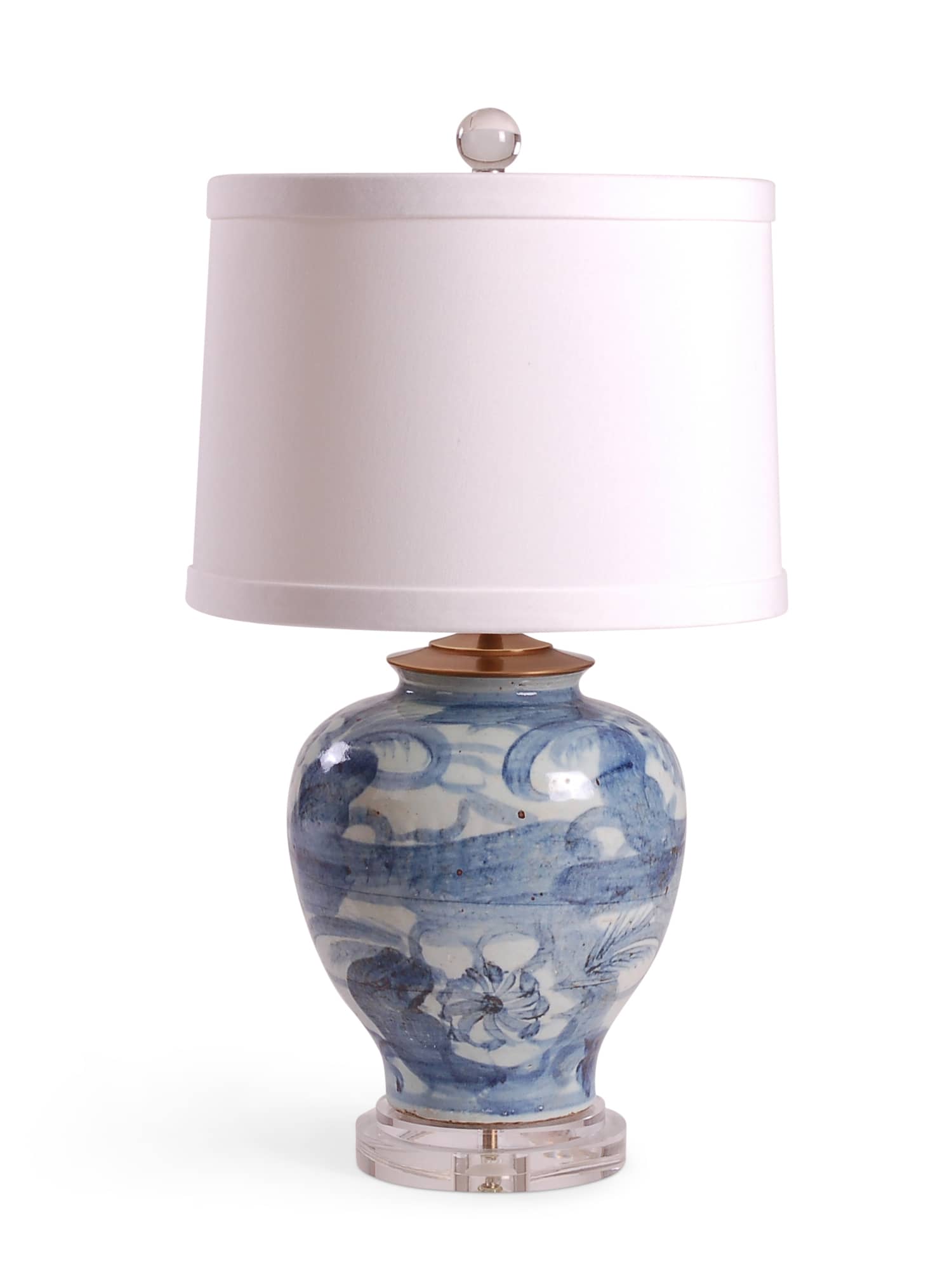 Reproduction porcelain vase lamp with blue and white Ming design and antique finish. Made with foot-stomped clay. Comes on an acrylic base with 0.5″ trim drum shade in white.