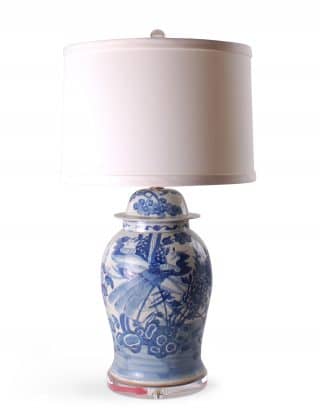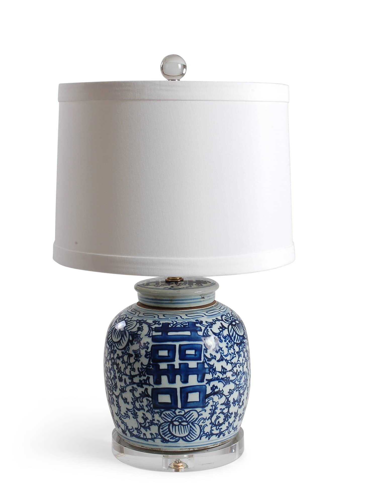 Reproduction porcelain jar lamp with blue and white double happiness design. Comes on an acrylic base with 0.5″ trim drum shade in white.