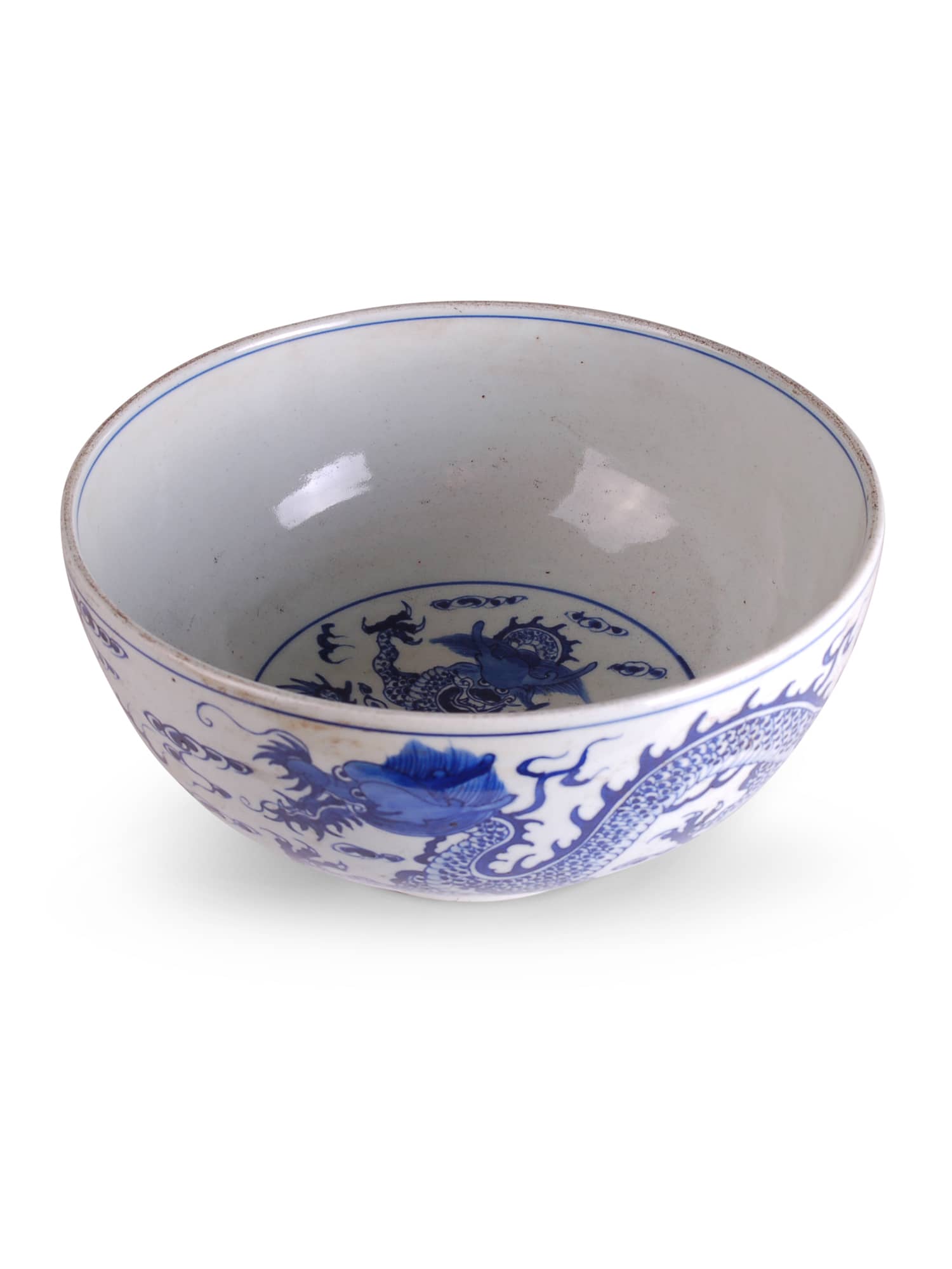 Reproduction porcelain bowl with blue and white dragon design.