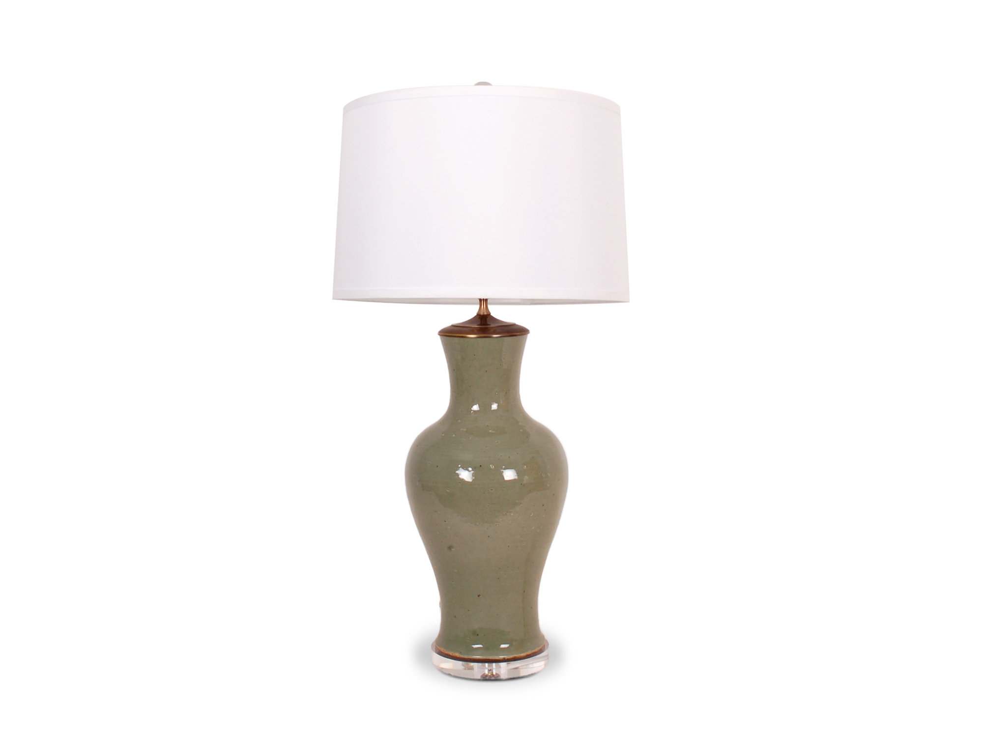 Reproduction porcelain guanyin shaped vase lamp in celadon on acrylic base with white drum shade. Made with footstomped caly. Features real brass hardware with hand-rubbed antique finish.
