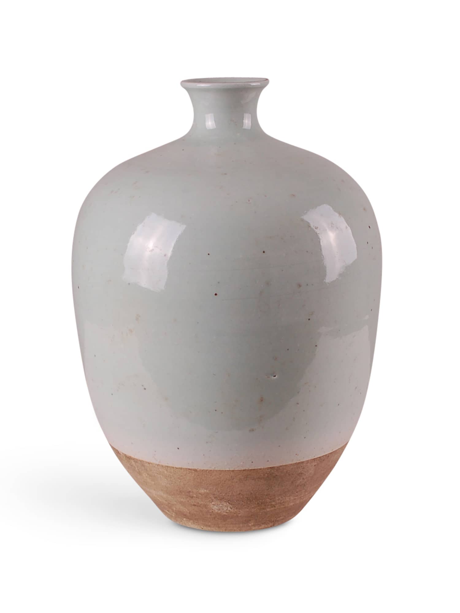 Reproduction porcelain mei ping shaped vase in celadon. Base is partially unglazed for a rustic look.