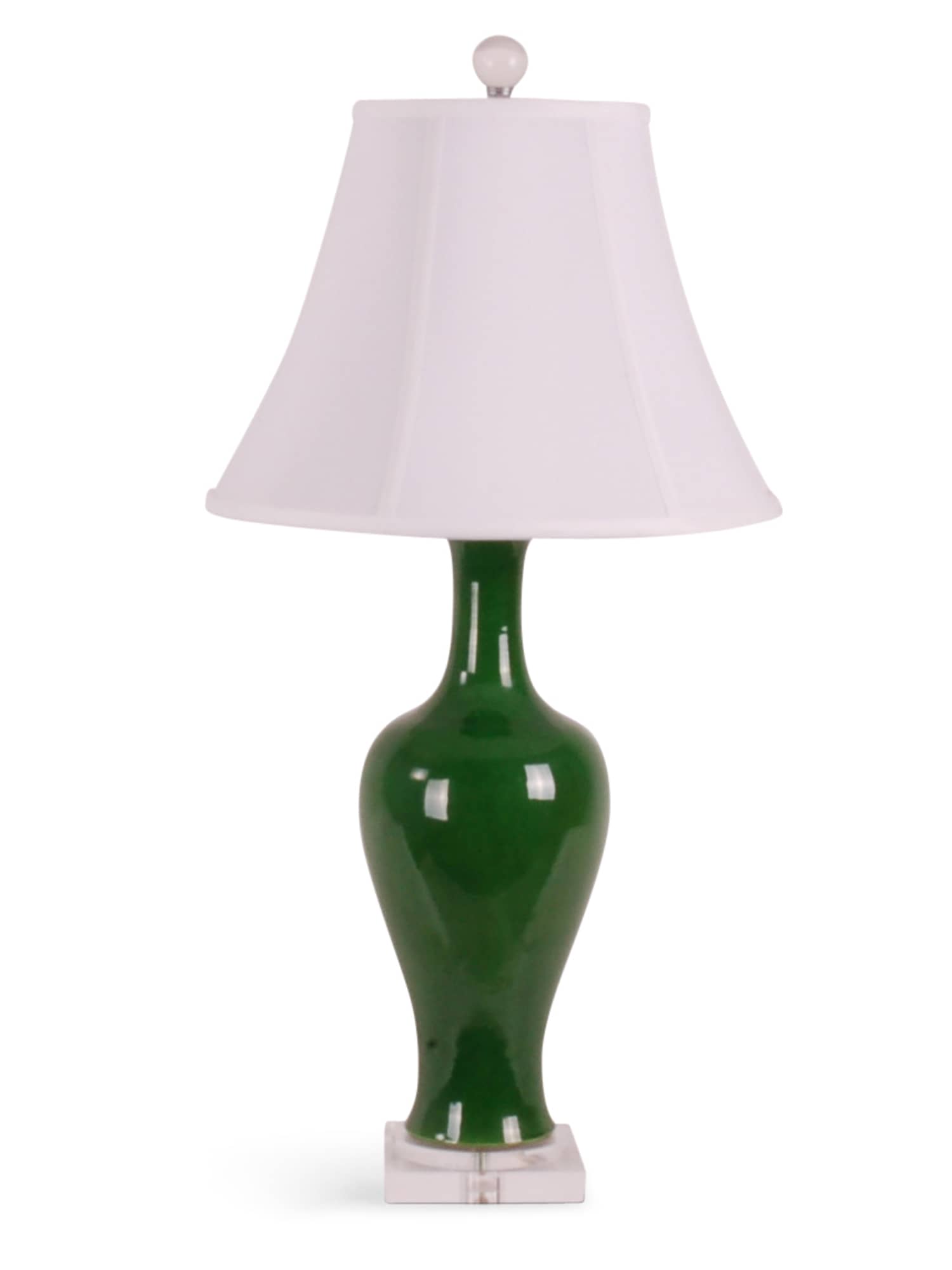 Reproduction porcelain fishtail shaped vase lamp in green on acrylic base. Comes with white bell shade. Features real brass hardware with hand-rubbed antique finish.