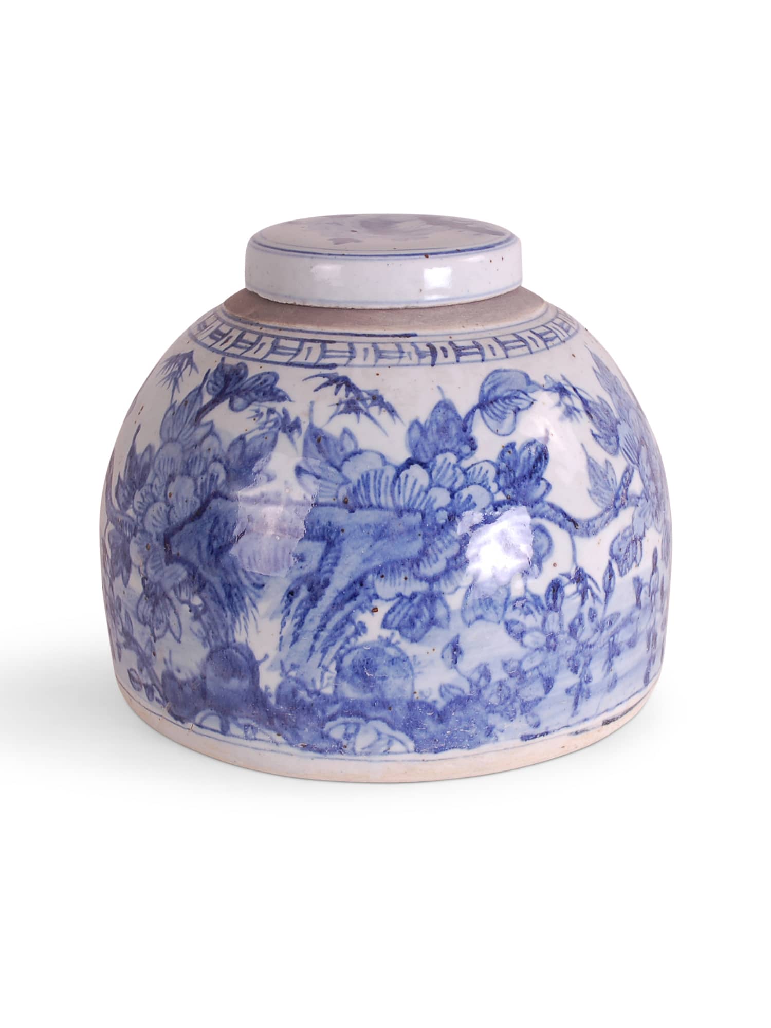 Reproduction porcelain jar with blue and white bird and flower design. Made with foot-stomped clay.