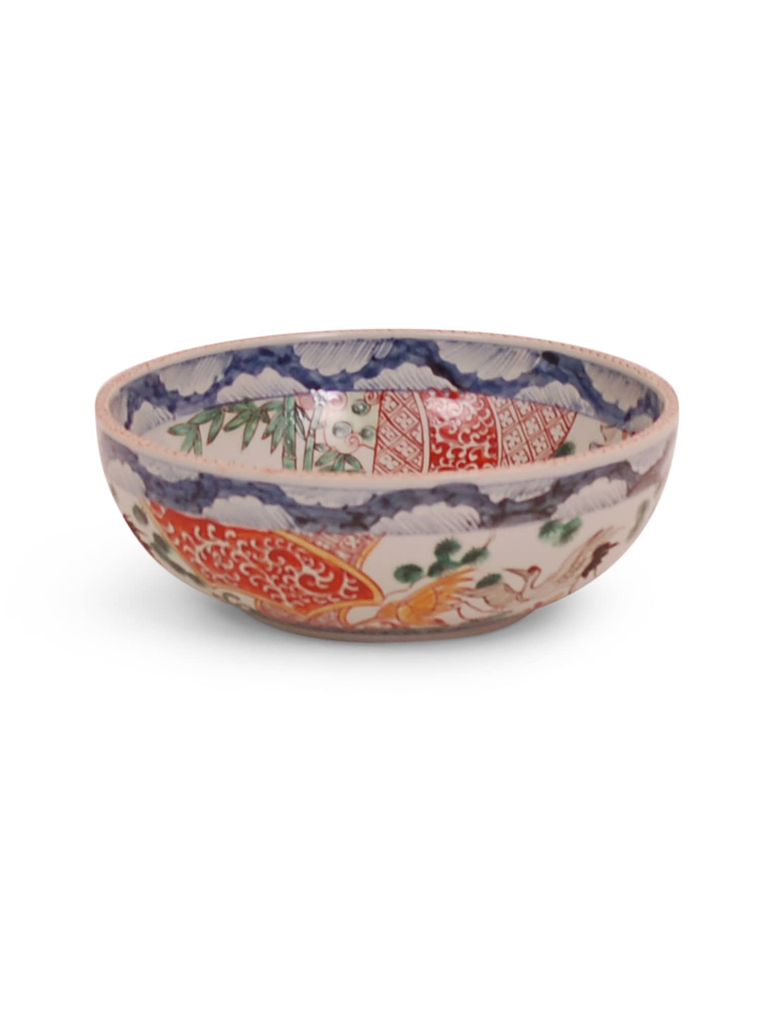 Reproduction porcelain bowl with multicolored Japanese crane design.