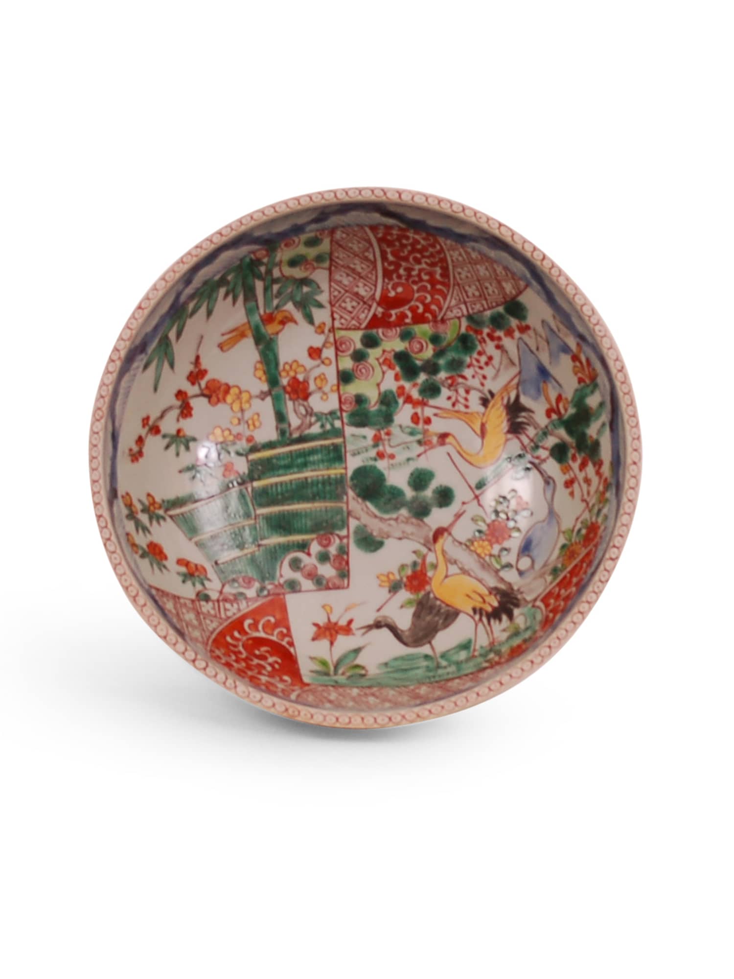 Reproduction porcelain bowl with multicolored Japanese crane design.