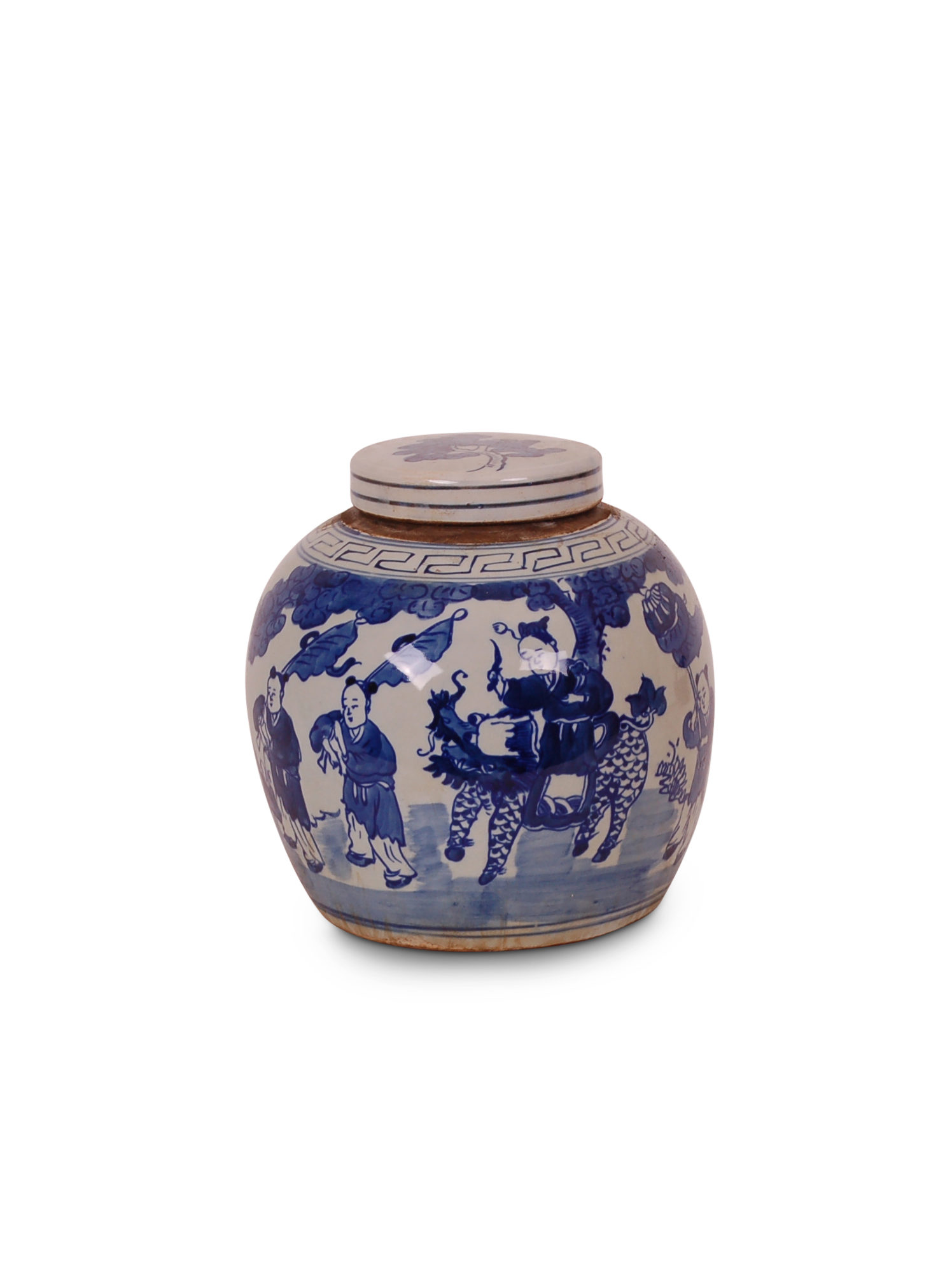 Reproduction porcelain jar with blue and white children with foo dog design.