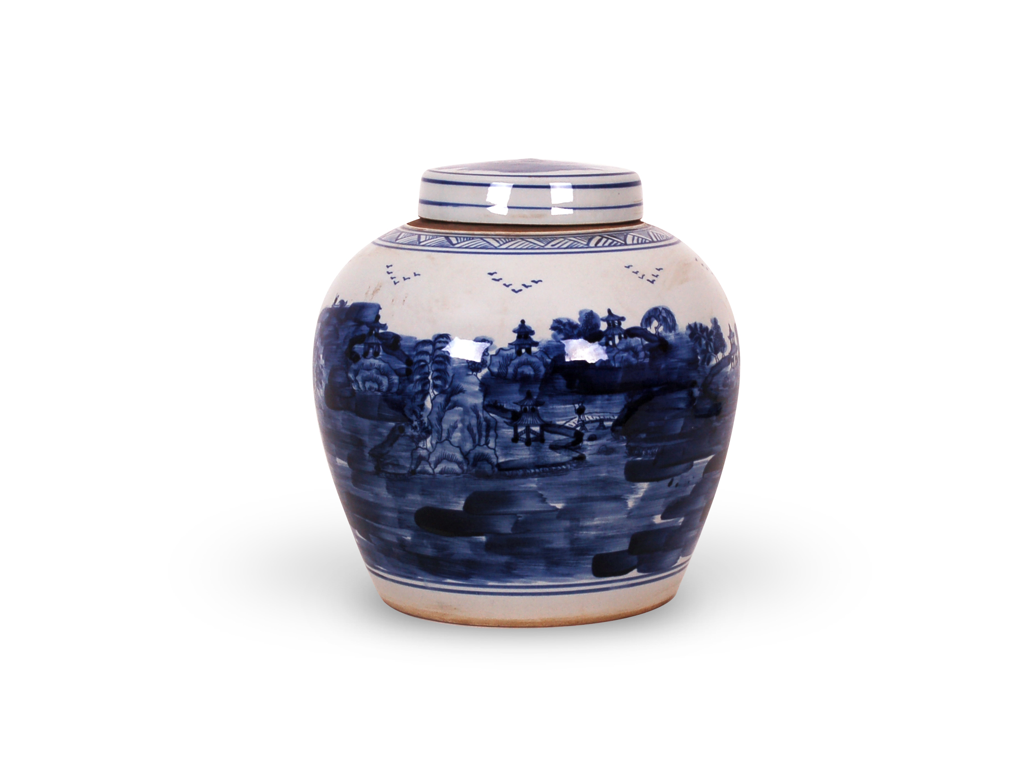Reproduction porcelain jar featuring hand painted blue and white Canton design. Due to hand craftsmanship and hand painted design, final product may differ from what is shown in the photo.