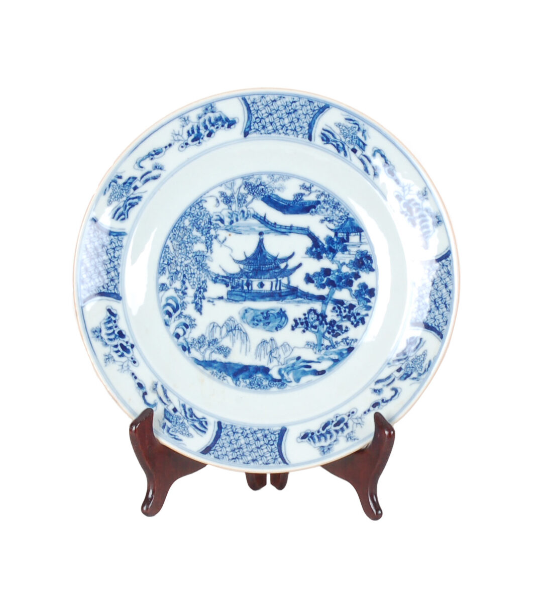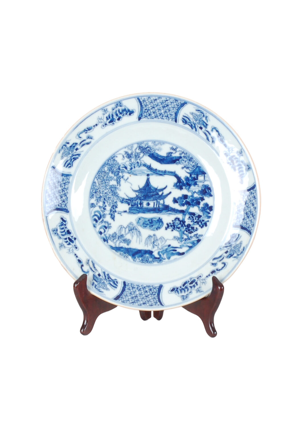 Reproduction hand formed porcelain plate with hand painted blue and white Canton landscape design.