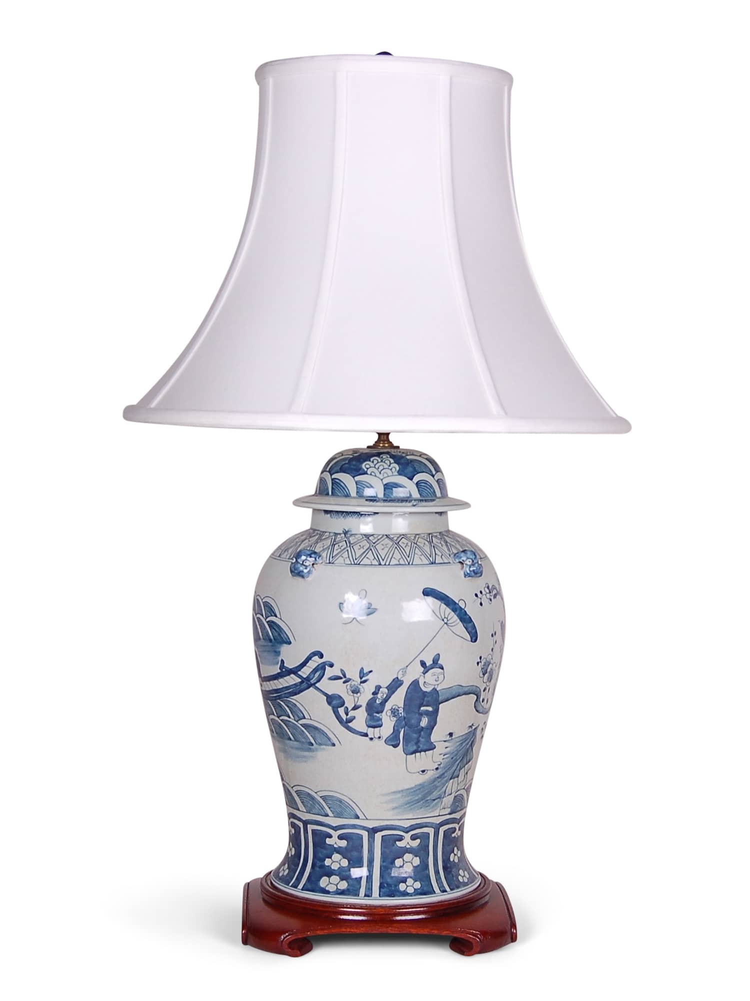 Reproduction porcelain ginger jar lamp with blue and white figures design. Comes on a wood base with white bell shade.
