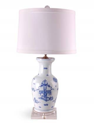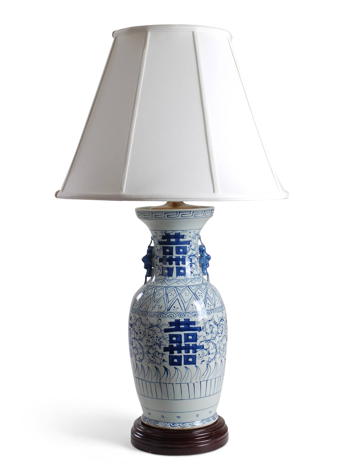 Reproduction porcelain vase lamp with blue and white double happiness design. Comes on wood base with white empire shade. Features real brass hardware with hand-rubbed antique finish.