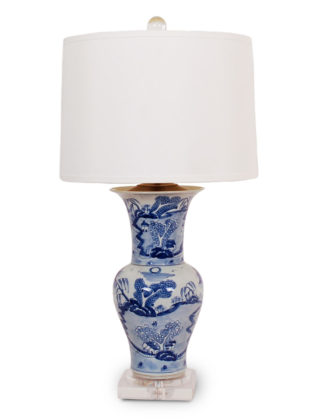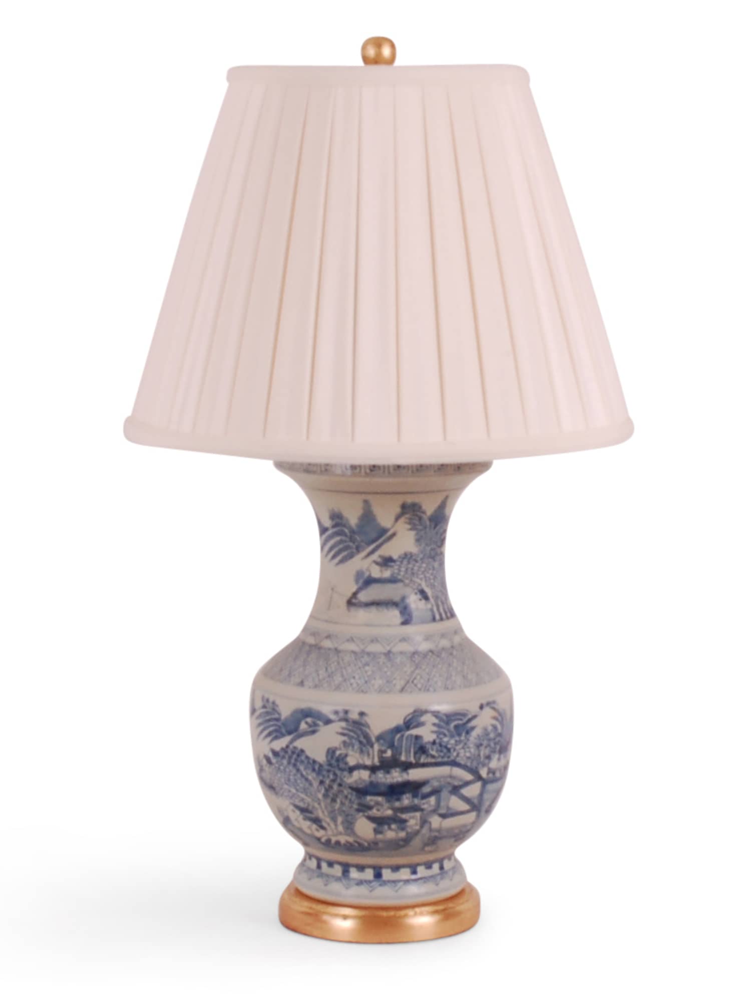 Reproduction porcelain vase lamp with blue and white Canton design on hand-gilded gold leaf base. Comes with a box pleated shade in cream. Features real brass hardware with hand-rubbed antique finish.