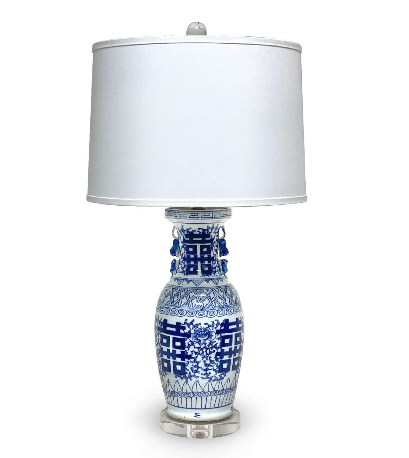 Reproduction porcelain vase lamp with blue and white double happiness design and carved foo dog handles. Comes on an acrylic base with 0.5″ trim drum shade in white. Features real brass hardware with hand-rubbed antique finish.