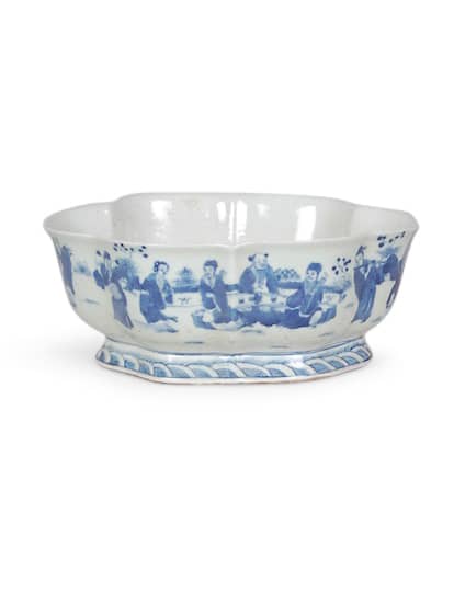 Reproduction porcelain rectangular oval bowl with blue and white figures design.