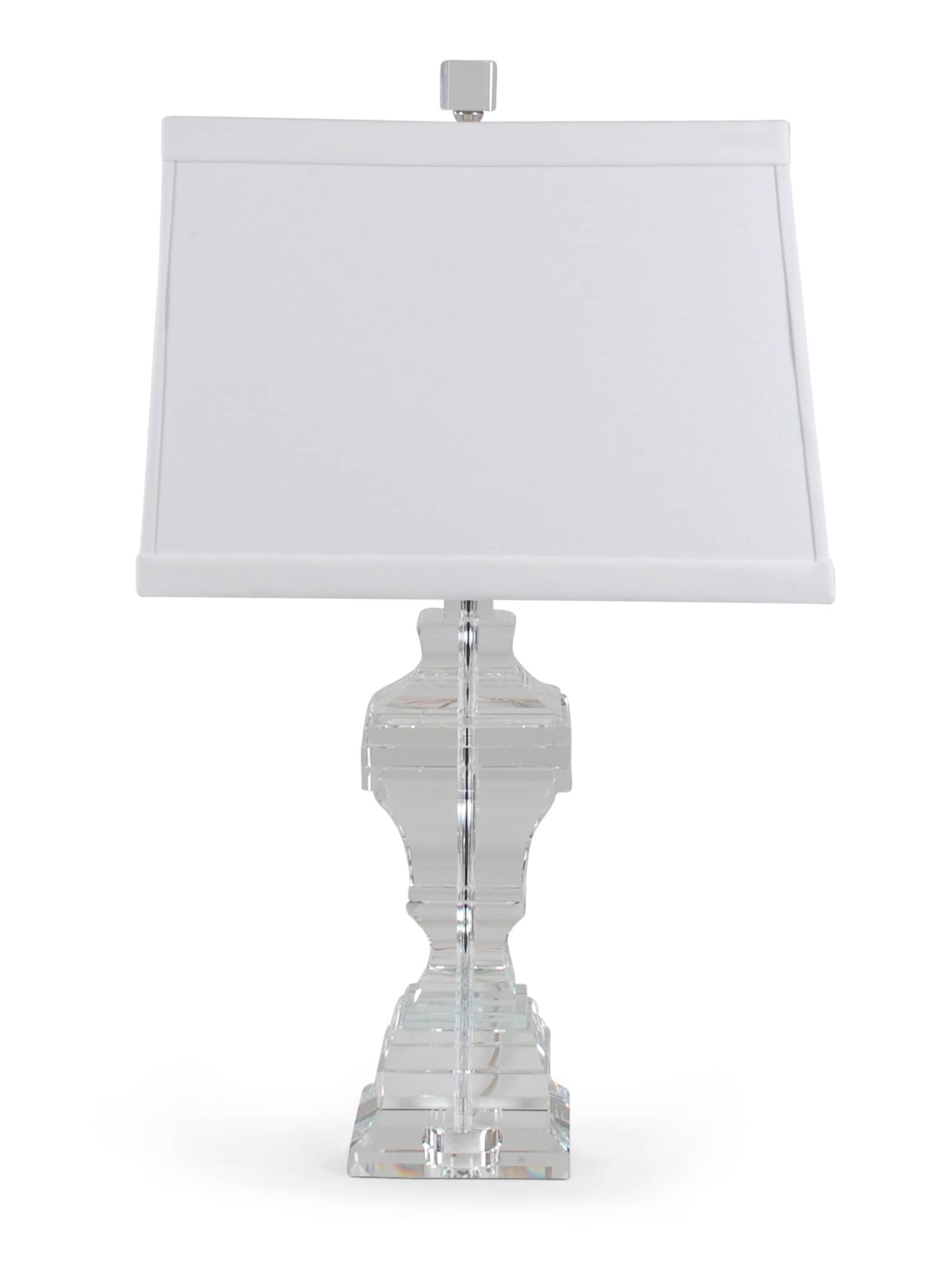 Crystal ornate urn-shaped lamp with rectangular white drum shade.